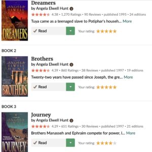 Next, I found Angela Hunt’s 3-book series, Legacies of the Ancient River. Each book—Dreamers, Brothers, and Journey—explored Joseph’s life and legacy. I devoured Genesis 37-50 as I read the novel that corresponded to the biblical text. Through the context of history and culture, Angie’s novels unveiled new insights from God’s Truth.
